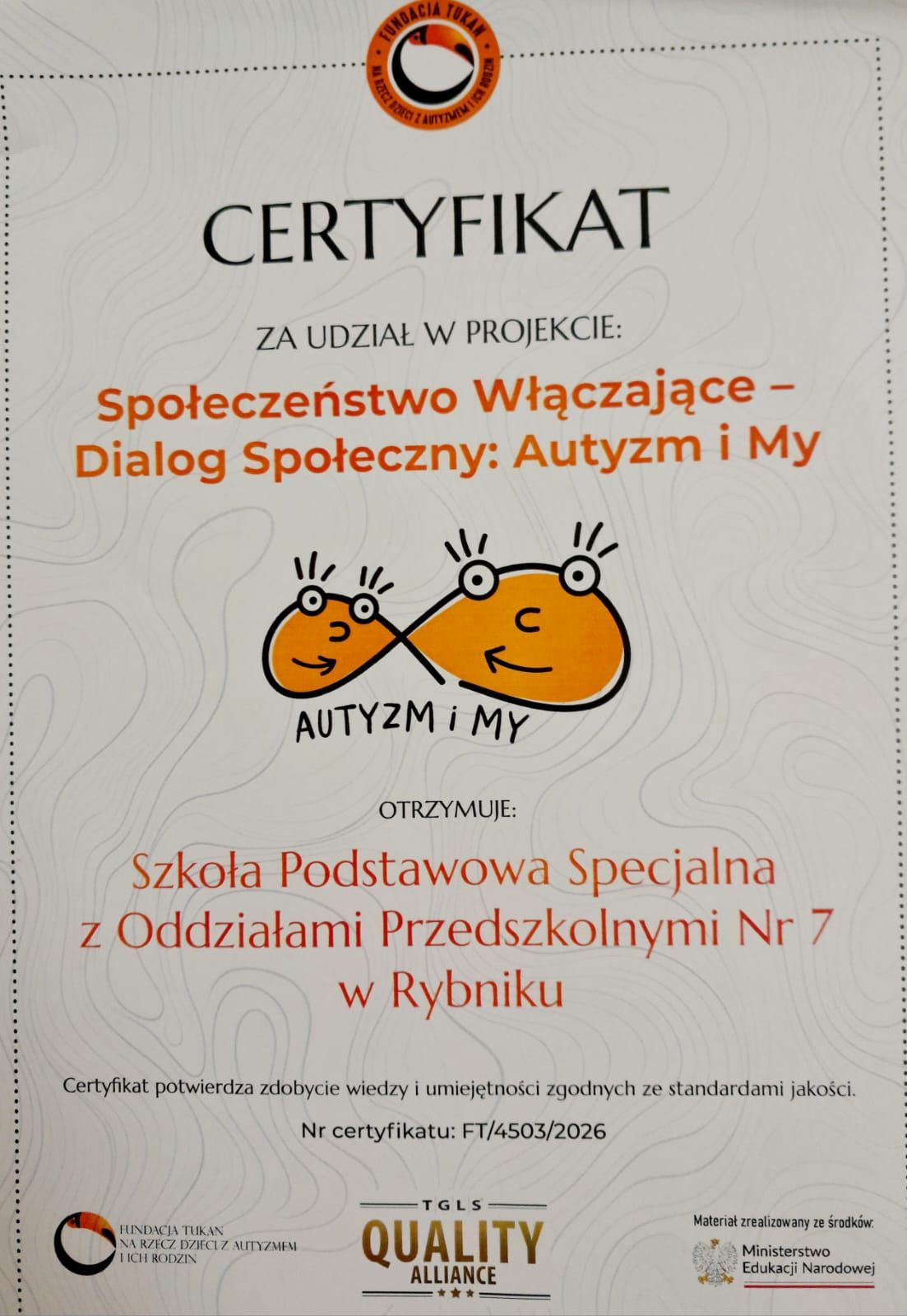 „Społeczeństwo Włączające – Dialog Społeczny: Autyzm i My” Oddziały Przedszkolne w Szkole Podstawowej Specjalnej z Oddziałami Przedszkolnymi Nr 7 w Rybniku otrzymały certyfikat udziału w