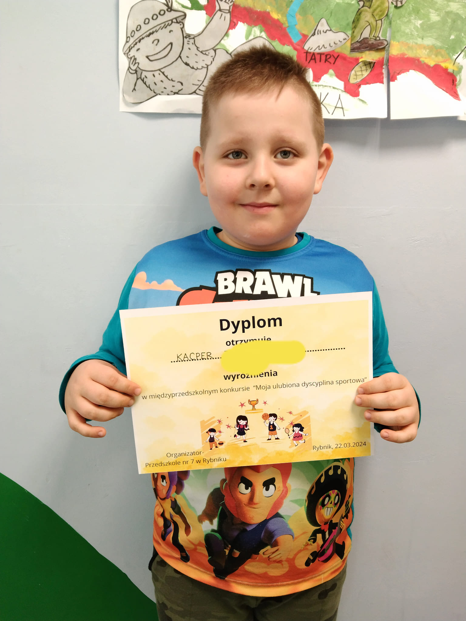 Moja ulubiona dyscyplina sportowa Z radością informujemy, że praca plastyczna naszego przedszkolaka, Kacpra z grupy Mrówki, została wyróżniona w konkursie „Moja ulubiona dyscyplina sportowa” organizowanym