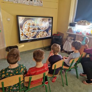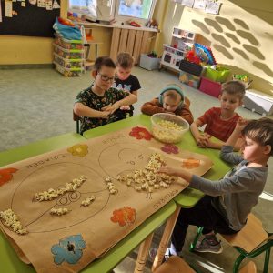 Dzieci obchodziły Dzień Popcornu, łącząc go z rozmowami o Babciach i Dziadkach. Wspólnie dzieliły się swoimi skojarzeniami i wspomnieniami, a następnie wykonały wspólny portret Babci i Dziadka z wykorzystaniem popcornu.