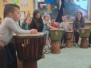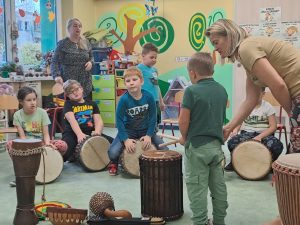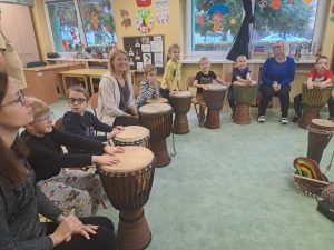 W ramach projektu: Klubik teatralno-muzyczny „Niebieska Siódemka” w naszym przedszkolu zorganizowane zostały warsztaty muzyczne dla dzieci i dorosłych z najstarszymi instrumentami na świecie – bębnami. Dzieci zapoznały się z różnymi instrumentami etnicznymi, które swoim dźwiękiem wpływają pozytywnie na nastrój i samopoczucie. Projekt jest sfinansowany ze środków Miasta Rybnika, oraz Stowarzyszenia na rzecz wspomagania osób z niepełnosprawnością i ich otoczenia „Razem.”